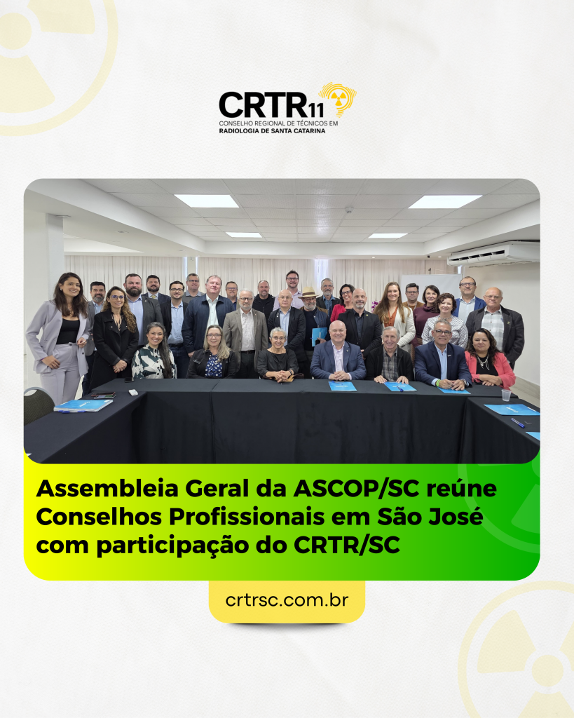 O Conselho Regional de Técnicos em Radiologia da 11ª Região (CRTR/SC) esteve presente na Assembleia Geral da Associação dos Conselhos Profissionais de Santa Catarina (ASCOP/SC), realizada nesta segunda-feira (18), em São José. O encontro contou com a participação do Diretor Presidente do CRTR/SC, TNR. Cleiton Mesquita Martio, e da Diretora Secretária, TNR. Neila Amengual Garcia.