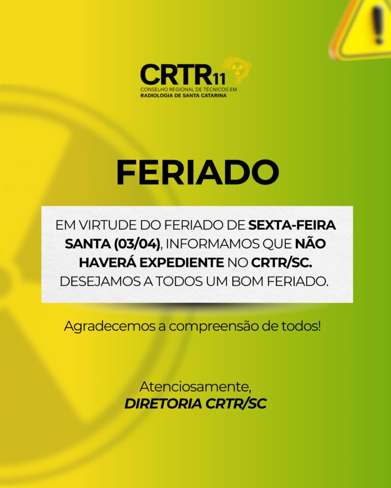 Informamos aos profissionais das técnicas radiológicas que, em razão do feriado de Sexta-Feira Santa (03/04), não haverá expediente na sede do CRTR/SC.