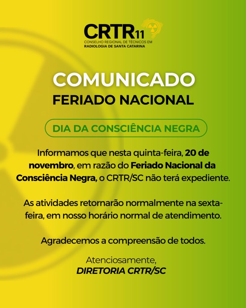 Nesta quinta-feira, 20 de novembro, em razão do Feriado Nacional do Dia da Consciência Negra, o CRTR/SC não terá expediente.